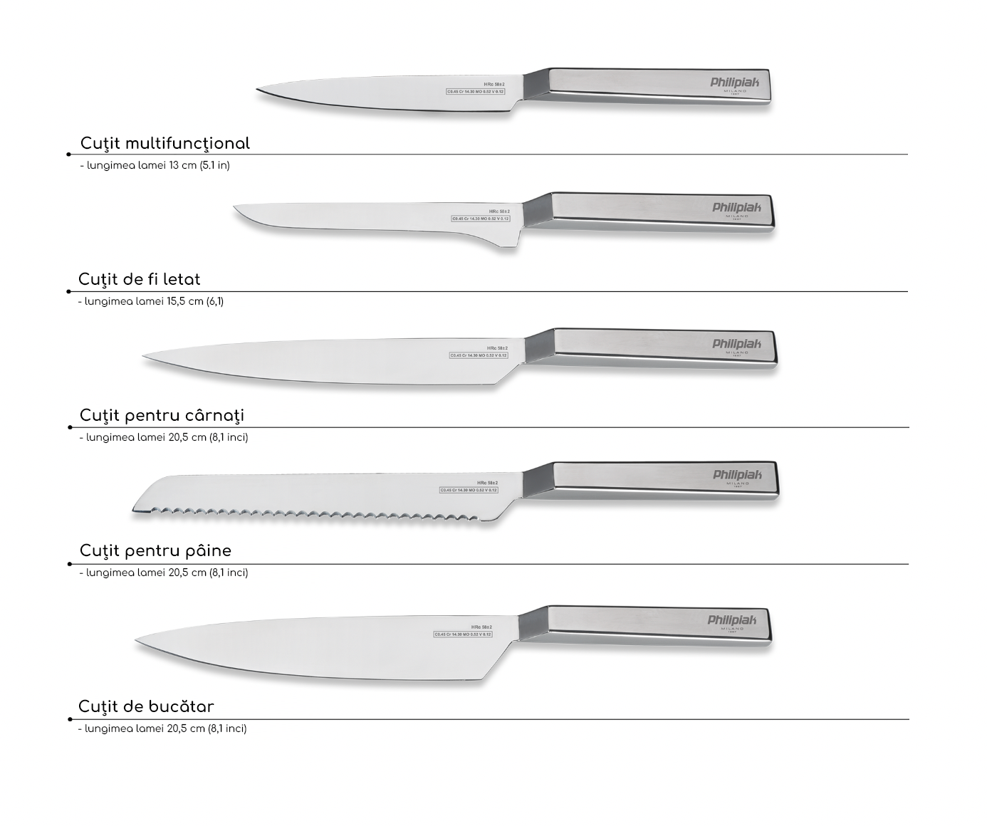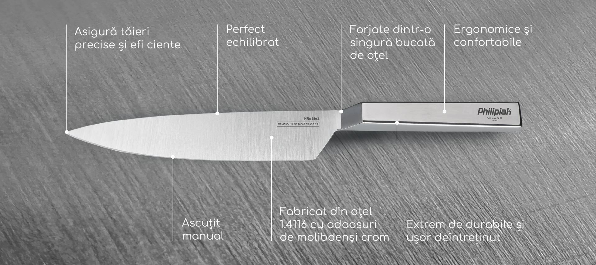 Cuțitele Philipiak Milano sunt fabricate din oțel inoxidabil de înaltă calitate, cu o duritate de HRc 58. Datorită proceselor tehnologice avansate, sunt foarte ascuțite și durabile, fără a necesita ascuțire frecventă. Tăierea, tocarea și curățarea devin activități ușoare și plăcute. Mânerele cuțitelor sunt proiectate conform noilor tendințe în design, fiind confortabile de utilizat, iar profilul și forma lor se potrivesc perfect bucătăriilor moderne. Suportul elegant pentru cuțite, realizat din sticlă securizată și lemn, este dotat cu compartimente adaptate, oferind comoditate în depozitarea cuțitelor. Întregul set adaugă prestigiu și eleganță bucătăriei.